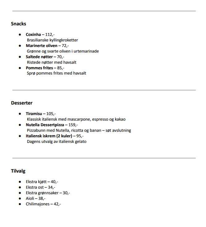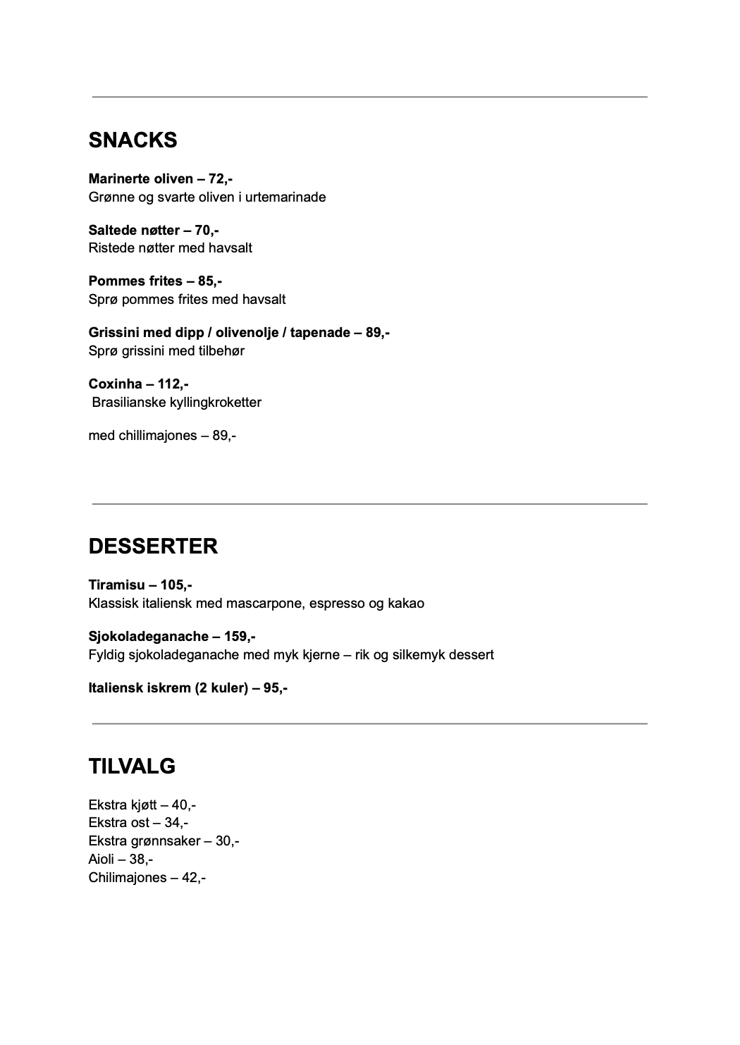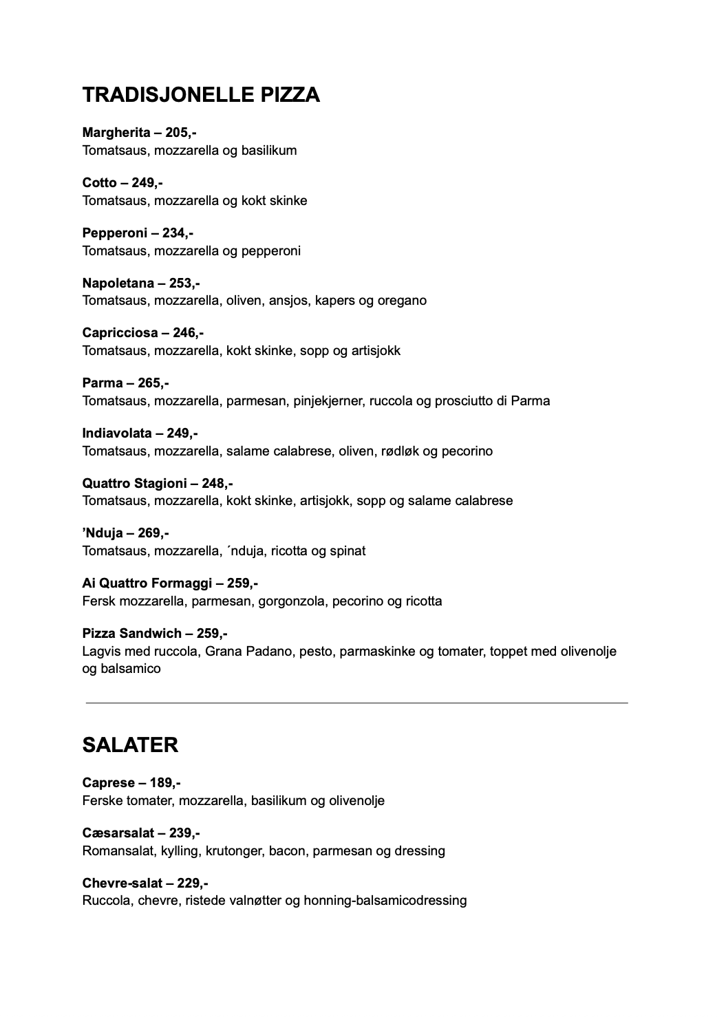 Vi serverer småretter inspirert av tradisjoner fra Sør-Europa og Sør-Amerika. Vår italienske pizza lages fra bunnen av med nøye utvalgte råvarer fra både Norge og Italia. Pizzaene stekes i steinovn ved høy temperatur for å oppnå en perfekt sprø bunn og en smakfull opplevelse.