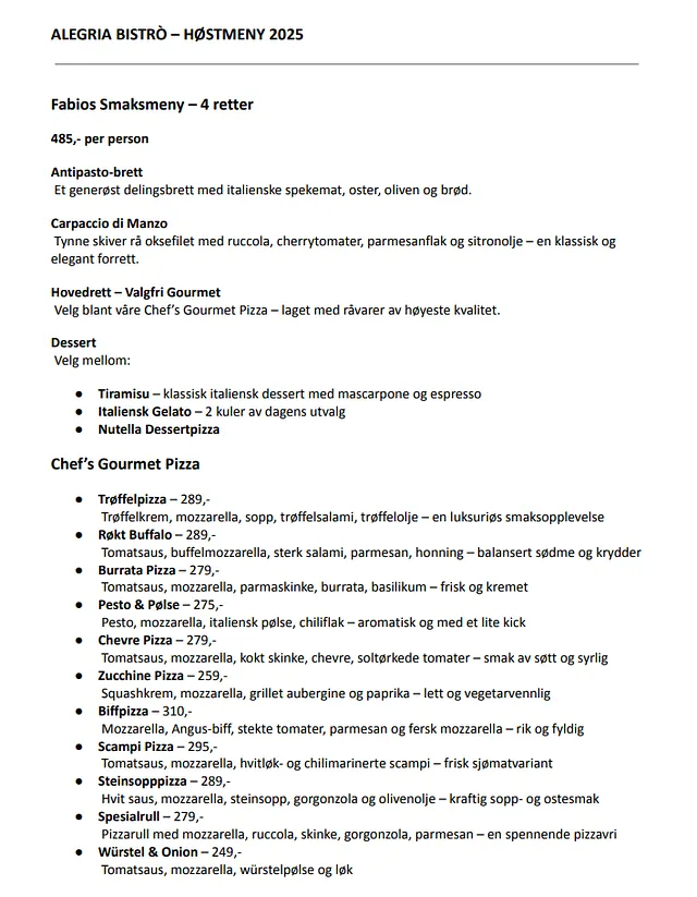 Savner du smaken av Alegria Bistro? Nå kan du enkelt bestille din favorittrett og nyte den hjemme. Se vår takeaway-meny og bestill ditt neste måltid i dag!